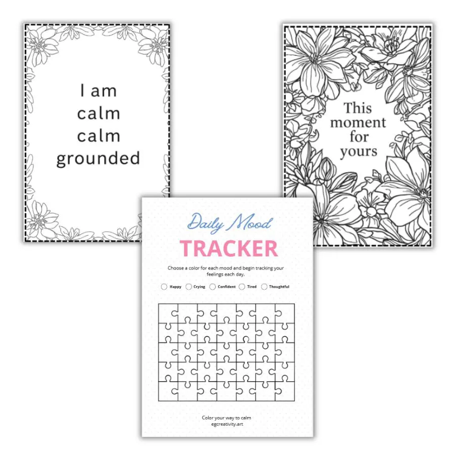 The affirmation cards are sized to complement the A4 coloring pages and feature positive, grounding statements — perfect to display, gift, or tuck into a journal. The mood tracker helps you observe patterns and celebrate small emotional wins with zero pressure.