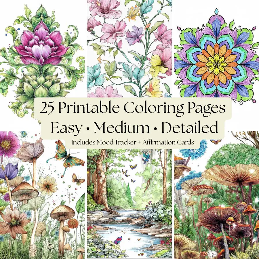- 🎨 25 Calming Coloring Pages — a variety of mindful, botanical, and abstract designs (valued at $15)
