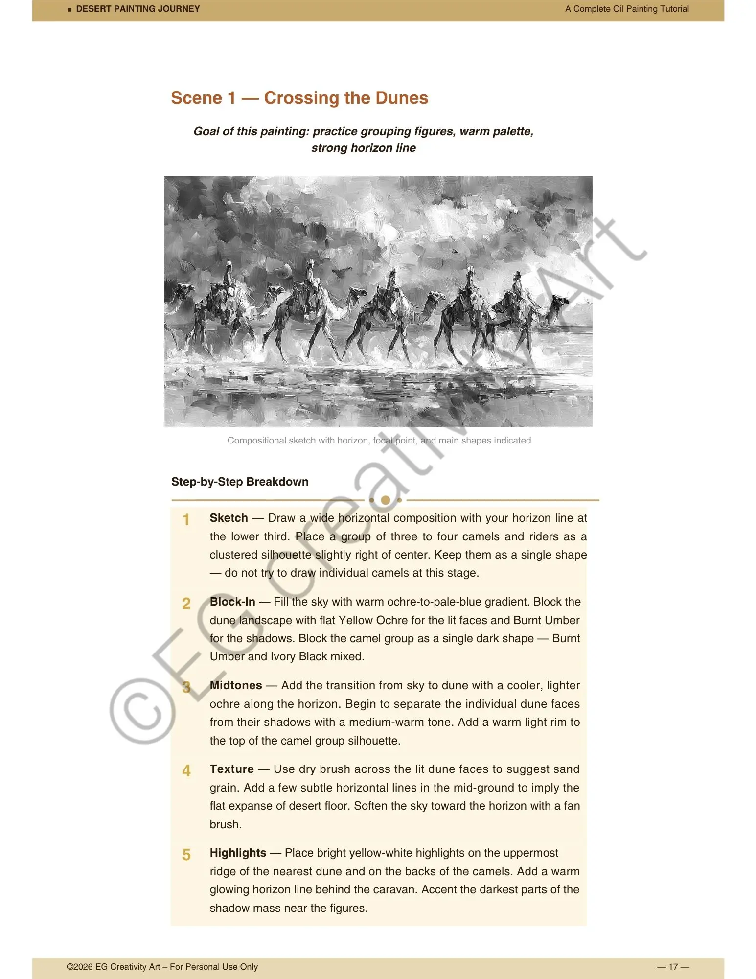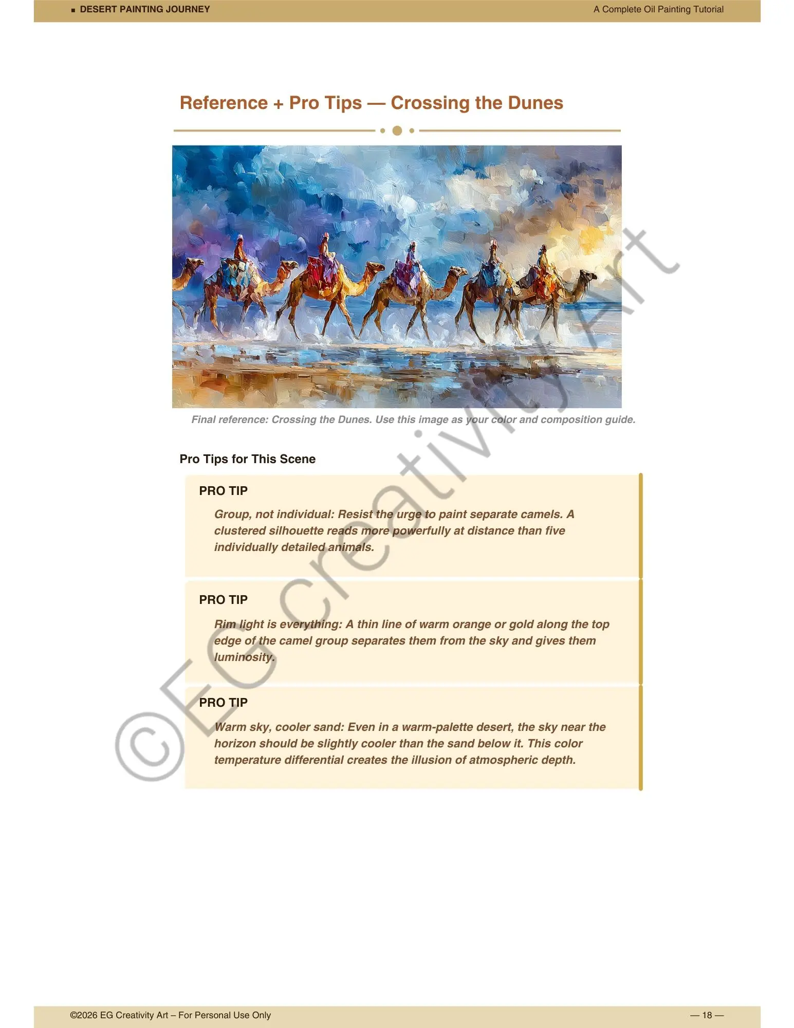 Whether you paint on stretched canvas, canvas boards, or oil painting paper, with student-grade or professional paints, this guide works with what you already own. Five dedicated Travelers scenes feature camel caravans, silhouettes at dusk, and figures disappearing into sandstorms — iconic desert compositions that work beautifully at any skill level and any canvas size.