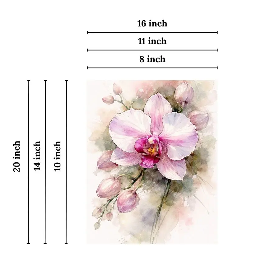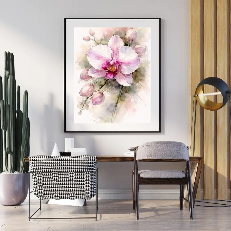 (For the art lovers and mixed-media creators in the room!) The watercolor orchid wall art design pairs effortlessly with a wide range of interior color stories — think warm whites, sage greens, charcoal grays, terracotta accents, and soft navy. Whether your space is Scandinavian-minimal, bohemian-layered, or classic and traditional, this floral wall art for living room or bedroom environments adapts effortlessly. It works equally well framed in natural wood, sleek black, or ornate gold.